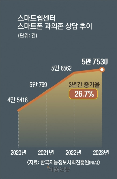 30ÀÏ ¼¿ï½Å¹®ÀÌ Á¤º¸°ø°³ û±¸¸¦ ÅëÇØ Çѱ¹Áö´ÉÁ¤º¸»çȸÁøÈï¿ø(NIA)À¸·ÎºÎÅÍ ¹ÞÀº ÀڷḦ º¸¸é ½º¸¶Æ®Æù¡¤ÀÎÅÍ³Ý °úÀÇÁ¸¿¡ ´ëÇØ »ó´ãÀ» ¹ÞÀ» ¼ö ÀÖ´Â Àü±¹ ¡®½º¸¶Æ®½°¼¾ÅÍ¡¯ÀÇ »ó´ã °Ç¼ö´Â Áö³ÇØ 5¸¸ 7530°ÇÀ̾ú´Ù. 2020³â(4¸¸ 5418°Ç)º¸´Ù ½º¸¶Æ®Æù °úÀÇÁ¸¿¡¼ ¹þ¾î³ª±â À§ÇØ µµ¿òÀÌ ÇÊ¿äÇÑ ÀοøÀÌ 1¸¸ 2112¸í(26.7%) Áõ°¡Çß´Ù.